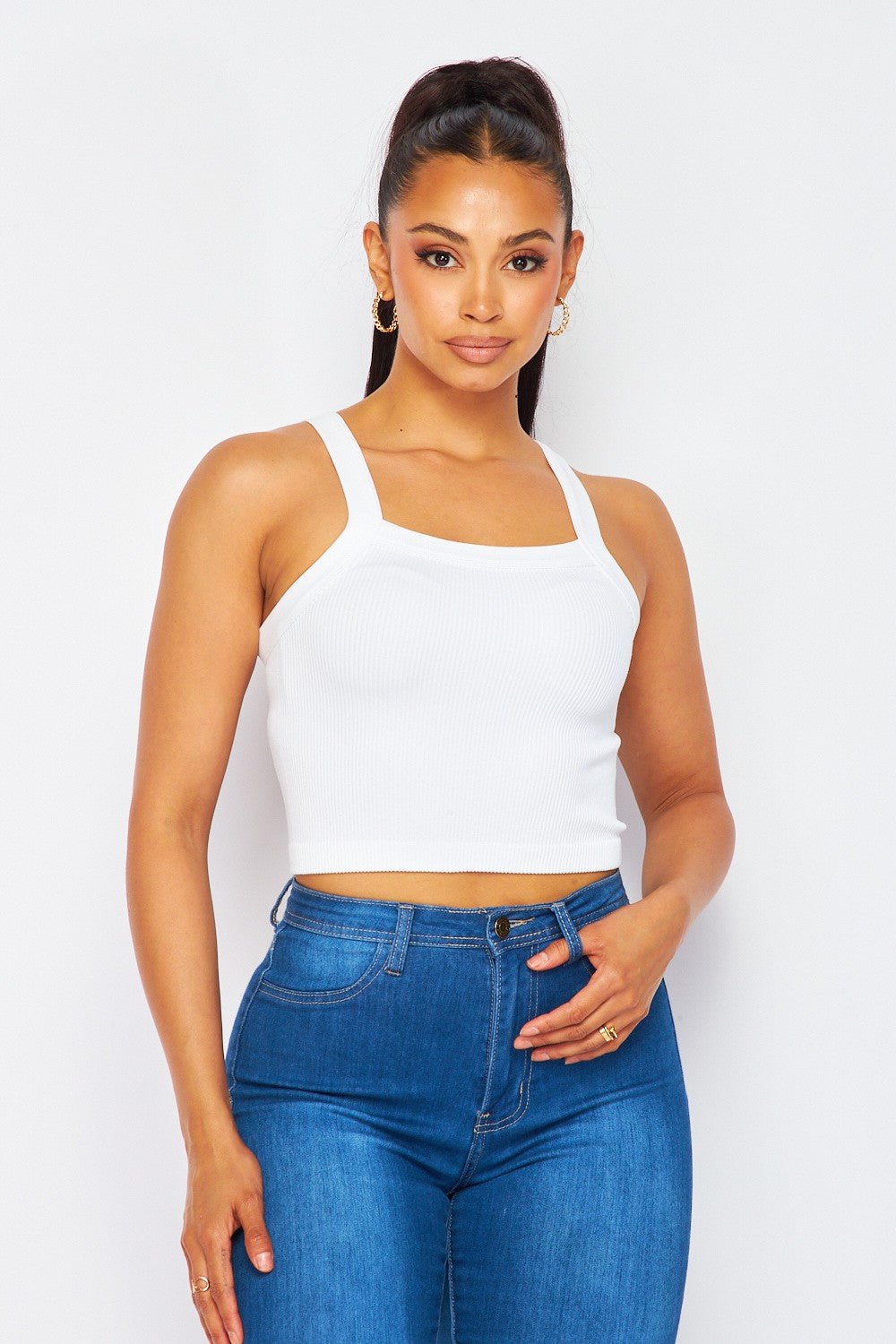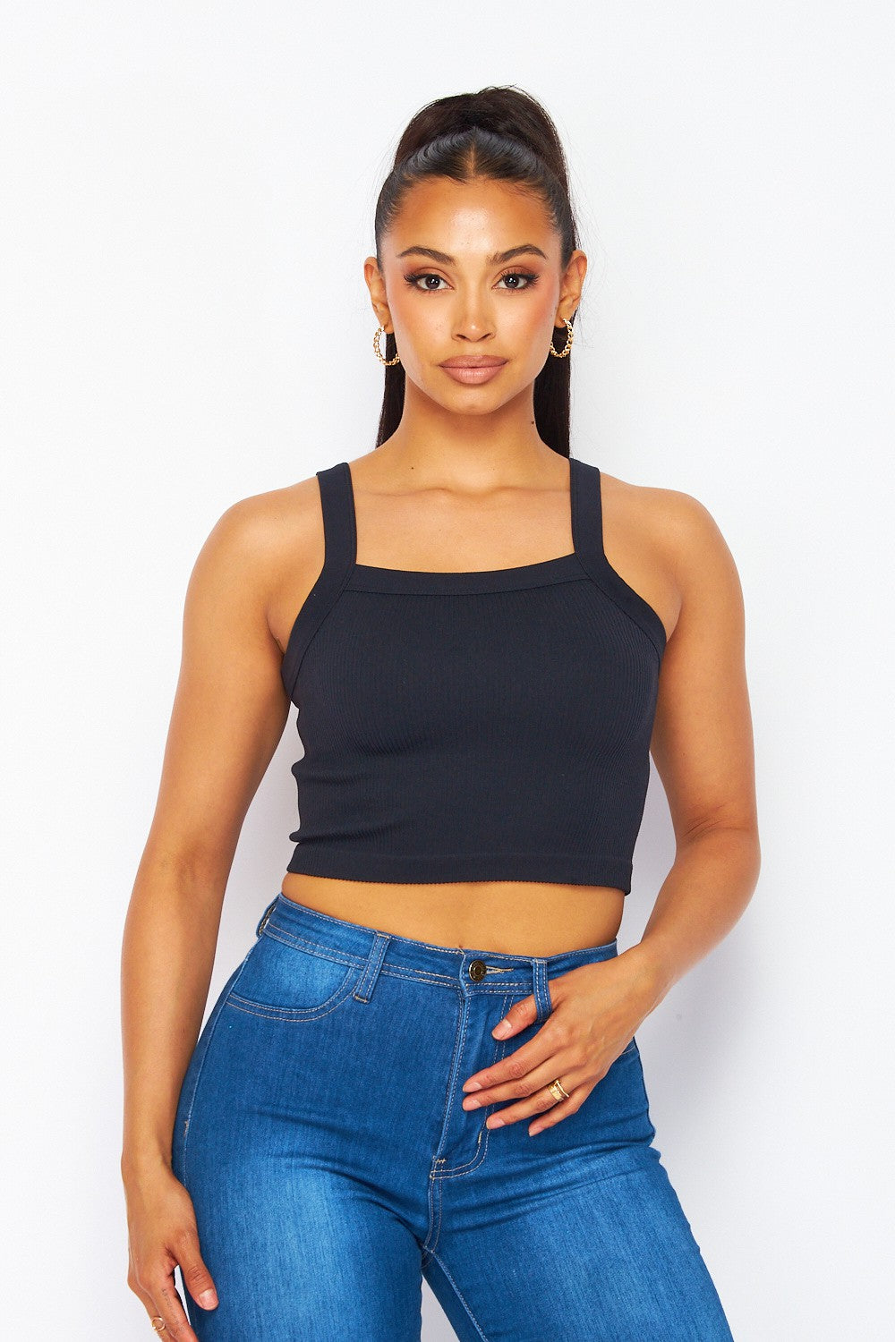 SEAMLESS RIBBED WIDE BANDED CROP TANK TOP. 92%Nylon 8%Spandex